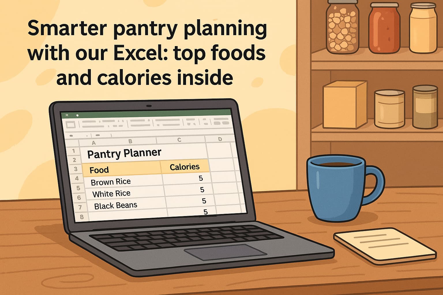 Want to make this easier? I’ve put together a Pantry Planner in Excel that calculates how much food you need based on your family size, days, and meals per week. It shows the totals in both kilograms and pounds, and also gives you the calories per week so you know you’re covered.